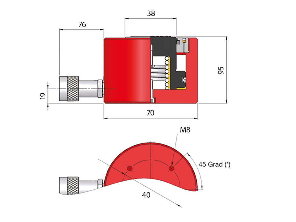 Nízká stavební výška umožňuje nasazení v prostorově omezených podmínkách, přičemž zdvih 40 mm zajišťuje dostatečný pracovní rozsah pro většinu aplikací.